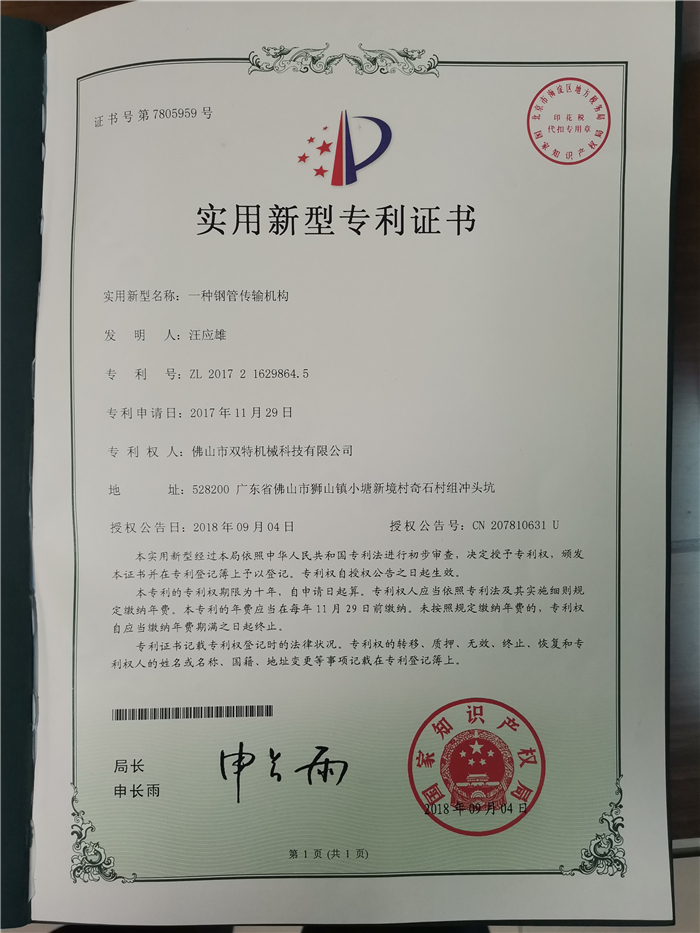 雙特制管機(jī)專利證書